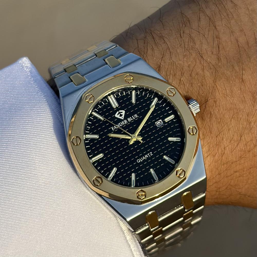 ساعة فندربلو رجالي بسير الستيل ذهبي فضي ميناء اسود